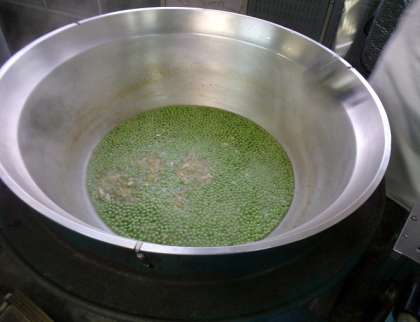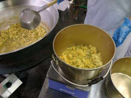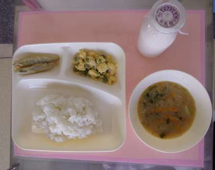 5月8日の献立は、ごはん、きびなごてんぷら、みそ汁、えんどうの卵とじ、牛乳です。えんどうの卵とじは、鶏肉とえんどうをだしで煮て、さとう、みりん、うす口しょうゆで味つけします。ここで、卵アレルギーの児童の分をとります。最後に、卵を入れ、よく火を通してできあがりです。