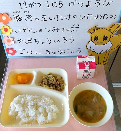 11月になり、給食もあたたかい汁ものが好評です。子ども達は、「いわしのつみれ汁」もおいしく、もりもり食べていました。「かぼちゃういろう」も給食調理員の手作りです。「毎日食べたいくらいにおいしいなあ」と喜んで食べていました。