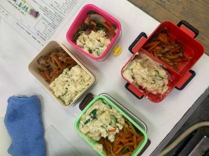 『いためる』の野菜炒めと、『ゆでる』のツナポテトサラダを作りました。
