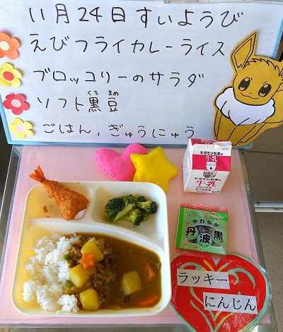 「えびフライカレーライス」も、子ども達に人気があります。さらに、カレーのにんじんを、給食調理員が、お花や星の形に型抜きして入れました。子ども達は、今日も喜んで、味わって食べていました。