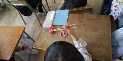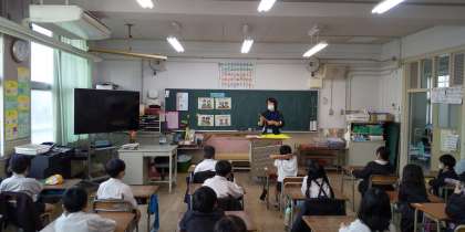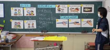 1年生のきょうしつで食育(しょくいく)のじゅぎょうがありました。きゅうしょくなどしょくじをするときのマナーについてまなびました。つづいてお箸(はし)が上手(じょうず)に使(つか)えるようになると、どんなよいことがあるか、ひとりひとりがじぶんのかんがえをはっぴょうしていました。