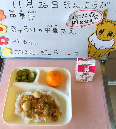 中華丼は、豚肉、うずら卵を主材に、はくさい、たまねぎ、たけのこ、にんじん、しょうが、しいたけを使用しています。うずら卵を入れる前に、アレルギーの児童分をとり、個別対応も行いました。「今日もおいしかった」と、子ども達に好評でした。