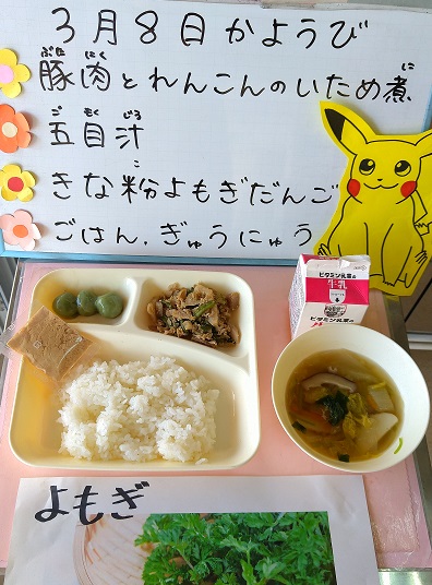 年に1回、3月の給食に「よもぎだんご」が登場します。お米とよもぎで作ったシンプルなだんごをオーブンで蒸し、砂糖としょうゆで作ったタレをからめました。そして、子ども達が、きな粉をかけて食べました。「おいしい」「おかわりしたよ」と、今日もよくかんで、味わって食べていました。