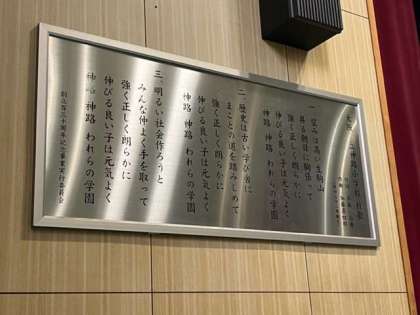 講堂に掲げられた神路小学校の校歌も、新入生のみなさんを楽しみに待っています。