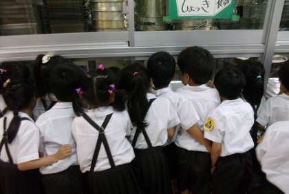 1年生が生活科で、栄養教諭と給食ができるまでの学習をし、給食室に見学に行きました。たくさんの食材や大きな道具と機械にビックリ。おいしく作られている秘訣をいっぱい知ることができました。