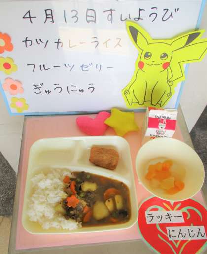 今日は、入学お祝い献立でした。カツカレーライスがとっても美味しかったです。