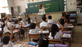 1年生の授業は算数「あわせていくつ ふえるといくつ」の学習でした。たくさんの参観者の中、いっしょうけんめいに考えて発表していました。