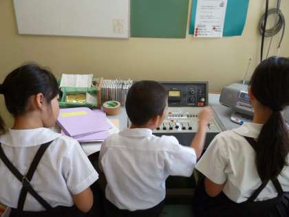 放送委員会の朝の活動のようすです。さわやかな曲をながしあいさつをし、朝の予定を呼びかけています。読書タイムのある火・水曜日には、「これから、読書タイムです。静かに本を読みましょう。」とアナウンスをし、10分間の音楽を流します。落ち着いた雰囲気の中の読書タイムです。