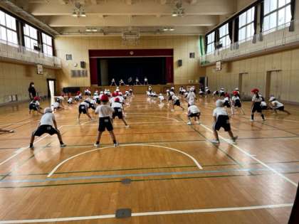 今日は天気が良くないので、体育館で体育です。まずは準備運動。