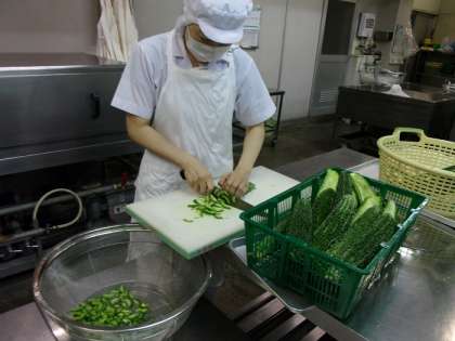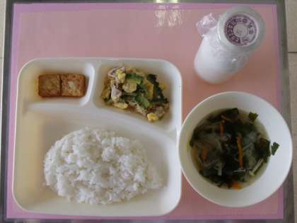 ゴーヤチャンプルーは、年1回だけ7月に使用できる、にがうりを使った沖縄料理です。いり卵と合わせて炒めることで、にがうりの持つ苦みをやわらげ、彩りもよくしています。初めて食べる1年生もいました。おいしいと好評でした。