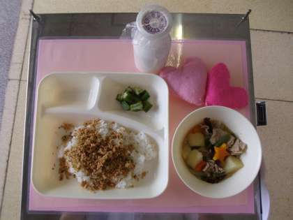 七夕ということで、給食調理員が、煮もののにんじんを星の形に型抜きしてみました。オクラの切り口の星の形とともに、子どもたちは楽しく、おいしく食べていました。