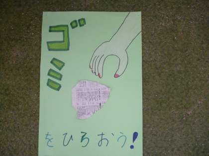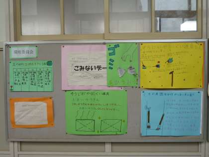 環境委員会の掲示板に掃除の仕方や用具の扱い方などを掲示しています。委員会の人たちが絵や図で分かりやすく書き、みんなに呼びかけています。また、「ゴミ0の日」を知らせるポスターもつくって、みんなで「ごみないデー」にしようと取り組んでいます。