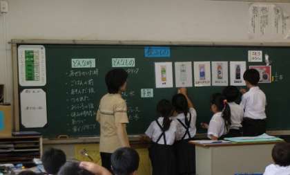 3年生が栄養教諭と、飲みものについて学習しました。児童は、いつどんな時に、何を飲んでいるかを振り返りました。また、飲みものの中に含まれている砂糖の量が想像以上に多いことに驚いていました。暑い夏を、じょうずに水分をこまめにとって、元気にすごしていきたいという思いが高まりました。
