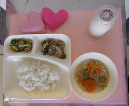 にゅうめんは、そうめんを使った汁ものです。青みに旬のオクラを入れました。そして、子ども達の食欲が増せばうれしいなと思い、給食調理員がにんじんをハートの形に型抜きして全クラスに数枚入れました。好評でした。