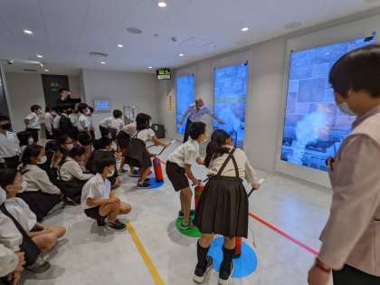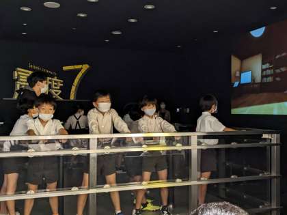 阿倍野防災センターでは、阪神淡路大震災や南海トラフ地震について学びました。震度7を体験し、揺れの大きさに驚いた様子でした。
