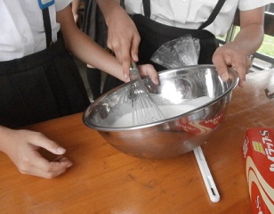 三日目、アイスクリームづくりをしました。泡だて器でホイップし氷と塩で低温にしてころがし、おいしいアイスクリームができあがりました。みんな嬉しそうに食べました。