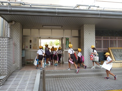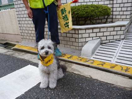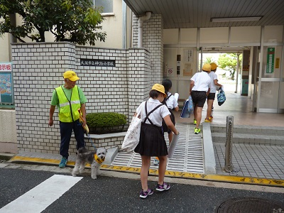 2学期が始まりました。夏休みの課題プリントや工作・絵画など自由研究した宿題も持って元気よく登校してきました。街角では地域の見守り隊の方々に「おはようございます。」とあいさつを交わす元気のよい声も聞こえてきました。正門では見守り隊の方の愛犬=見守り犬(ポップ)も子どもたちを出迎えてくれています。