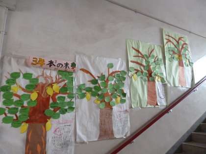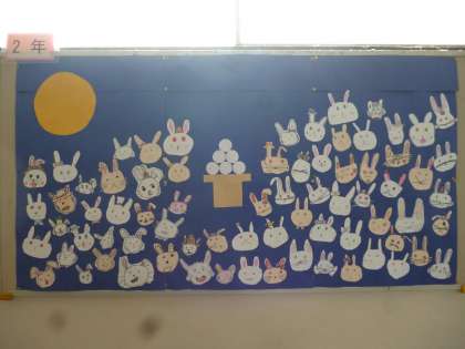 給食室前に9月の献立に関わる食物の紹介やメニューを掲示し、季節を感じながら食事ができるようにしています。また、1学期から始めている『読書の木』に実がついてきています。読んだ感想や本の紹介を葉にかき、それが何枚にもなったら次に実を掲示することができるのです。実が増えて来たことはそれだけたくさんの本を読んだことなのでしょう。お月見のかわいい掲示もあります。