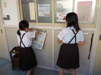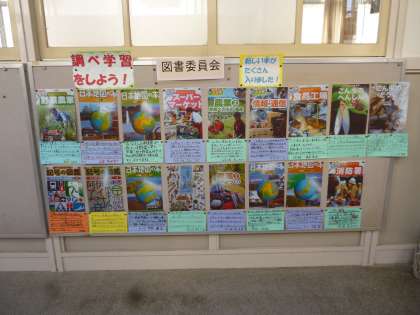 夏休みに入った新しい本の紹介をしています。調べ学習に使える図書です。図書委員会の人たちがわかりやすくかき、掲示して知らせています。また、「小学生新聞」を毎日取り換えて校長室前に置いています。
