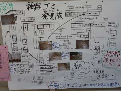 また、10日・20日・30日は「ゴミ0の日」(ゴミないデ—)としてその日には、環境委員会のメンバーが清掃後の見回りをしています。『神路ゴミ発見隊』と称して拡大した校内地図に掃除のいきわたっていない場所を明記して掲示して「すみずみまできれいにしよう。」と呼びかけています。次回は『そうじ名人』を発見して知らせる予定です。