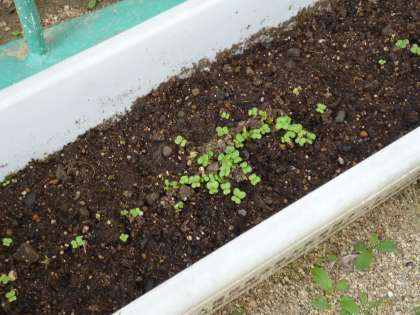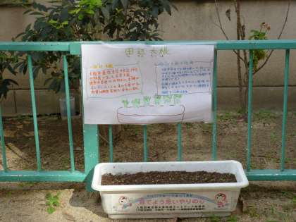 環境委員会では、1学期に伝統野菜として玉造黒門越瓜(たまつくりくろもんしろうり)を栽培していました。2学期は「天王寺かぶら」と「田辺大根」を育てます。野菜の特徴や育て方を調べ、種を植えたそばに掲示して知らせています。早速、かわいい芽を出し始めています。