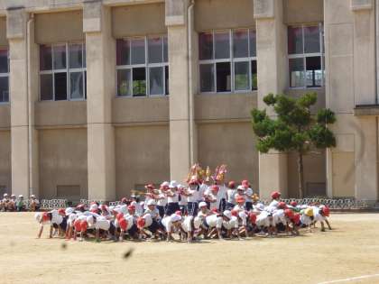 3年生「フラワー オブ マッスル!!」の団体演技のようすです。手首にきれいな『りぼんの輪』をつけて一生懸命に踊っていました。とても楽しそうにリズムにのって演技しています。