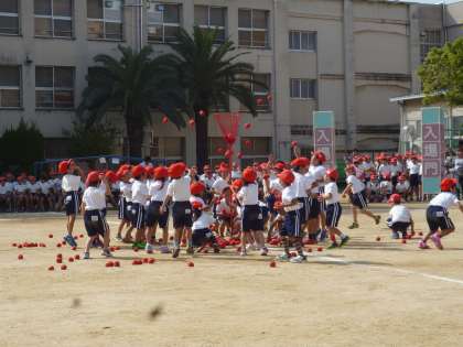 1・2年生の団体競技です。1年生は玉入れ、2年生は大玉転がしでした。いっしょうけんめいに紅白玉を拾っては投げ入れたり、大きな玉を2〜3人の組で力をあわせて転がしたりしている姿はとてもかわいく、頼もしくも思えました。
