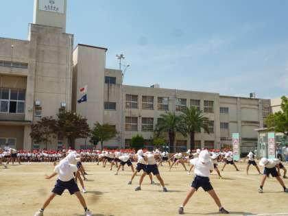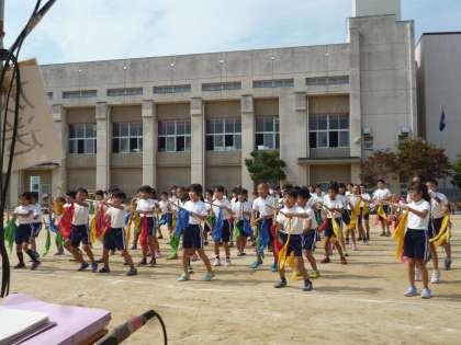 3・4・5年生の団体演技です。3年生は最初愉快なポーズや動きで始まり、4年生はバチにカラフルなバンダナをつけリズムよく打ち鳴らしながら踊り、5年生は力強くソーランを踊りました。どの学年も練習の成果を発揮し、見ごたえのある演技でした。