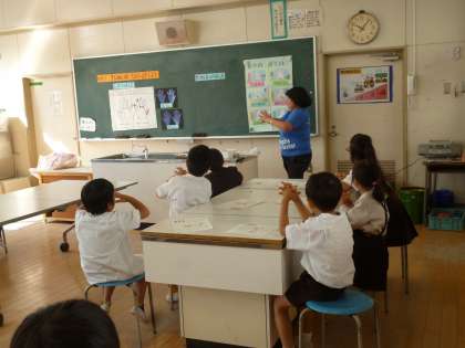 保健師さんに来校していただきました。縫いぐるみを使って楽しい手洗い指導の導入をしていただきました。子どもたちが手洗いの必要性に気付き、ていねいに手洗いができるように学習をしました。ローションを塗り、水だけで洗った手に『ブラックライト』にあてて汚れを見つける体験をしました。「わぁ 光ってる。」「白いところがまだある。」など口々につぶやきながら、学習カードにしるしをつけていました。最後に石鹸をつけてていねいに洗い、正しい手洗いのしかたも学習しました。