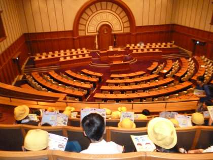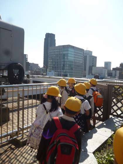 大阪市役所内を教育委員会の方に案内していただきました。まず、屋上に上がり「みをつくしの鐘」の由来の説明を聞き、屋上から市内をながめました。次に広いきれいな本会議場の傍聴席に着席し、「市会ってなあに?」のおはなしを聞きました。