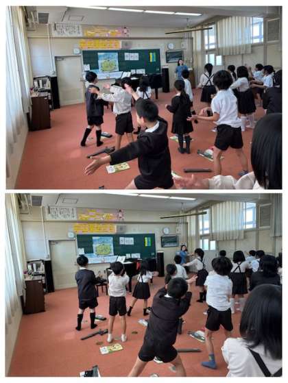音楽では、ビンゴの歌に合わせて体全体を使って表現しています。