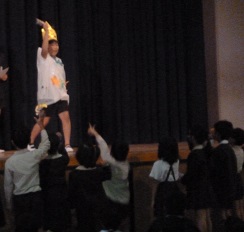 1学期に第1回目の「ジャンケン大会」でジャンケン王が負けてしまい、リベンジの第2回目のジャンケン大会をしました。神路っ子グループでジャンケンをして代表を決め、いよいよジャンケン王との対決でした。みんなの声援の中、今回はジャンケン王が勝ちました。大変盛りあがった集会でした。