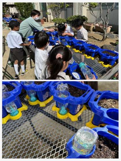 鉢にたくさんの水をまいていますが、鉢の下から水があふれています。