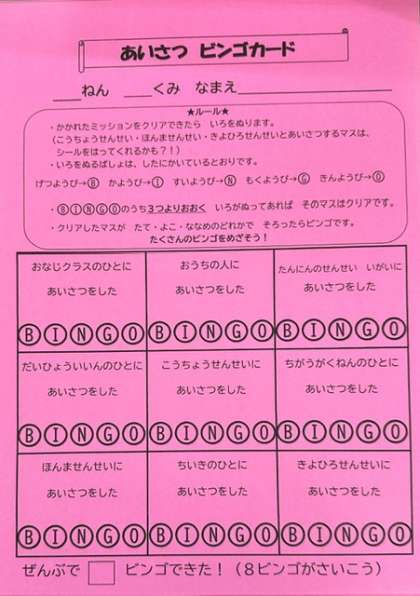 あいさつビンゴカードが配られ、ミッションをクリア出来たら色をぬります。