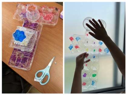 プラスチックの容器に色をぬったり、セロハンとつけたりして窓に飾ると・・・光が通ってきれいですね。