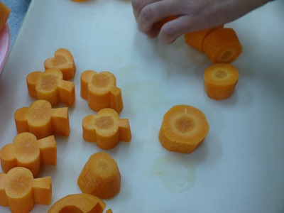 11月12日の給食は、レーズンパン、スープ煮、ほうれん草のグラタン、みかん、牛乳です。給食調理員が、スープ煮のにんじんを、今回はハートとクローバーの形に型抜きしてみました。子ども達はラッキーにんじんを見つけて、楽しく食べていました。