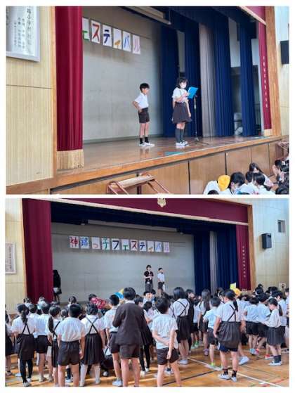 講堂ではじめの会をした後、水分補給を呼びかけて前半の準備をしました。