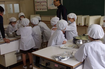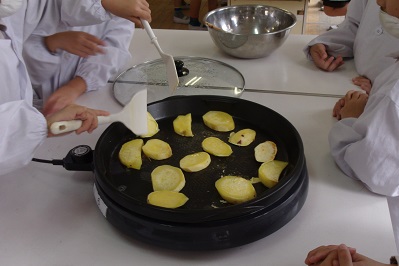 2年生が育てたさつまいもをホットプレートで焼きました。湯気やおいしそうな香りにワクワクしていました。5時間目に1年生といっしょに食べて交流するため、せっせと焼き、ていねいに包んで仕上げていました。