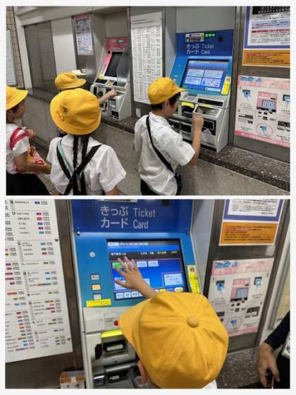 今里駅方面に歩きながら見学し、駅に着くと、先生からお金を受け取り切符の購入です。