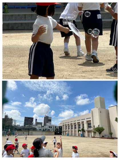 ストローで小さなシャボン玉を作って飛ばしたり、うちわや輪を使って大きなシャボン玉を作ったりして楽しんでいます。