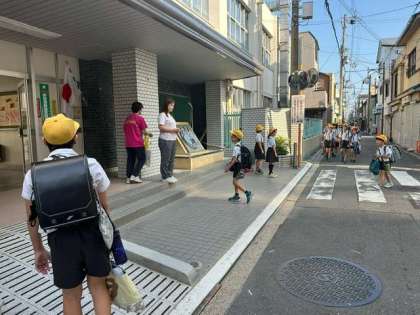 代表委員が正門前に立ち、自主的なあいさつを呼びかけています。