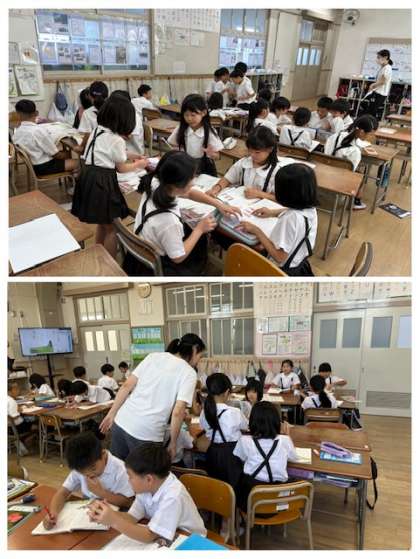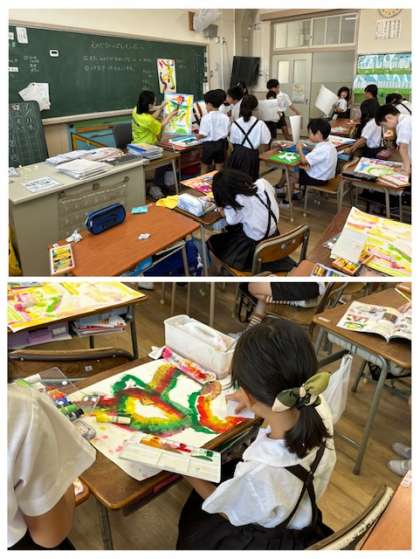 図工では、絵具やパスを使って、いろいろなぬり方で作品を作っています。