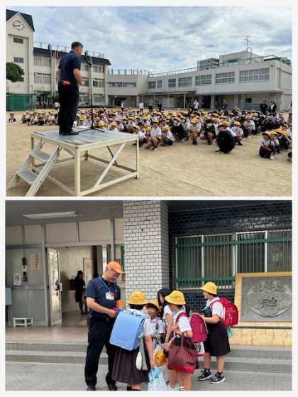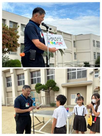 東成区長が登校時に子どもたちを出迎えていただき、全校朝会であいさつをしていただきました。