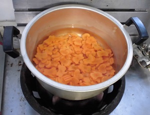 12月9日の給食は、冬野菜のカレーライス、ブロッコリーのサラダ、みかん、牛乳です。給食調理員がカレーのにんじんを、ハートとうさぎの形に型抜きしました。そして、ブロッコリーのくきの部分も、ちょうちょの形に型抜きしてみました。子ども達は喜んで食べていました。ラッキーにんじんを、大事に最後に食べている子もいました。