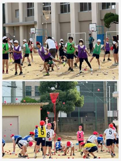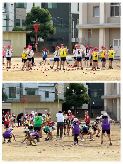 ダンスと玉入れを融合させた玉入れの練習です。楽しくできているようです。
