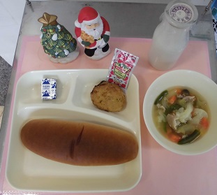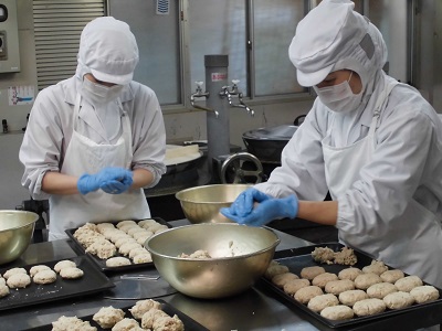 12月21日の給食は、黒糖パン、とうふハンバーグ、スープ煮、固形チーズ、牛乳です。とうふハンバーグは、ツナ、とうふ、荒みじんに切ったたまねぎ、砂糖、塩、しょうゆ、でんぷんを合わせ、混ぜます。1人1個ずつにまとめ、蒸し焼きにします。約500個作りました。子どもたちはおいしいと喜んで食べていました。