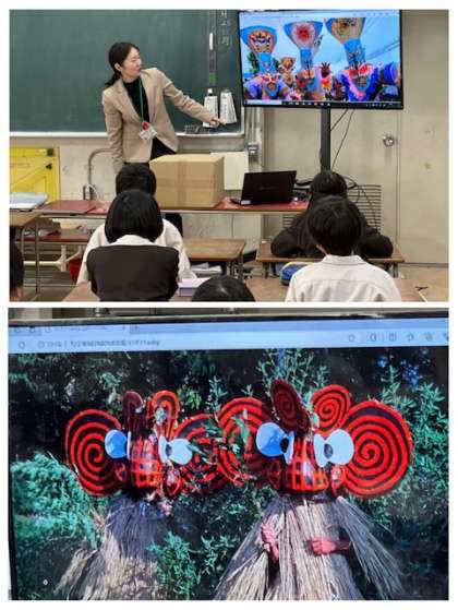 はじめにお面の映像でイメージを膨らませ、作り方を説明しました。