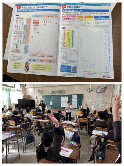 郵便局からの出前授業で、年賀状の書き方を教えていただきました。