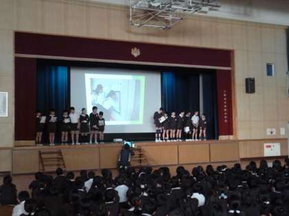 今週(25日〜29日)は給食週間でした。そこで、給食委員会が児童集会で給食について調べたことを発表したりクイズにしてみんなで考えたりして楽しく集会をしました。ラッカセイの実が土の中にできることを知り、驚いていました。また、各クラスから給食調理員さんへ感謝の手紙をかいていました。