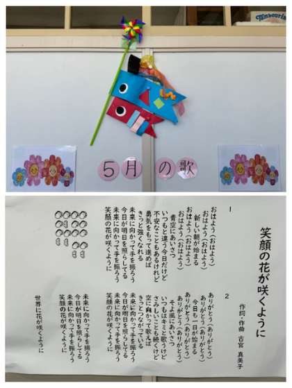 みんなが歌う歌として、5月の歌「笑顔の花が咲くように」を歌っています。